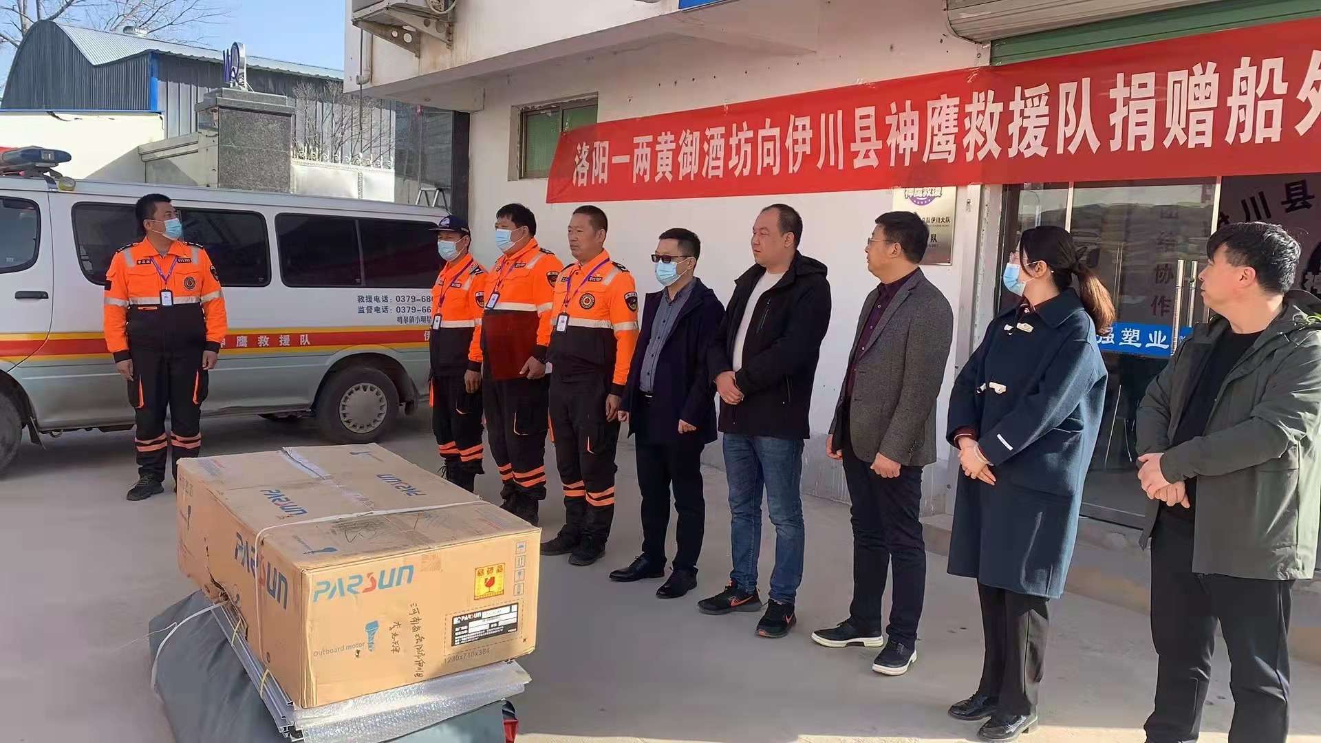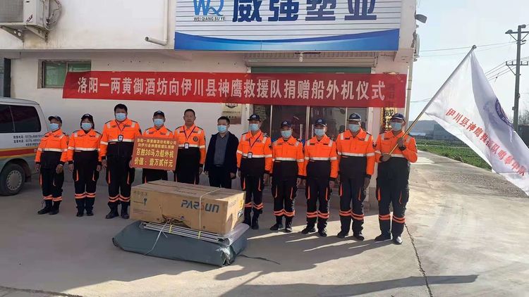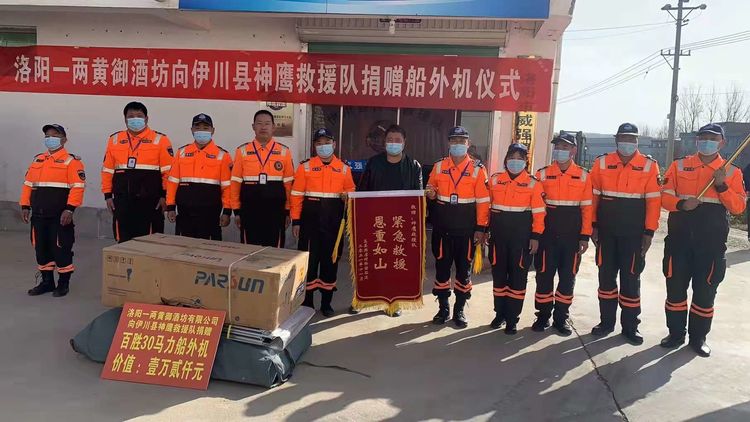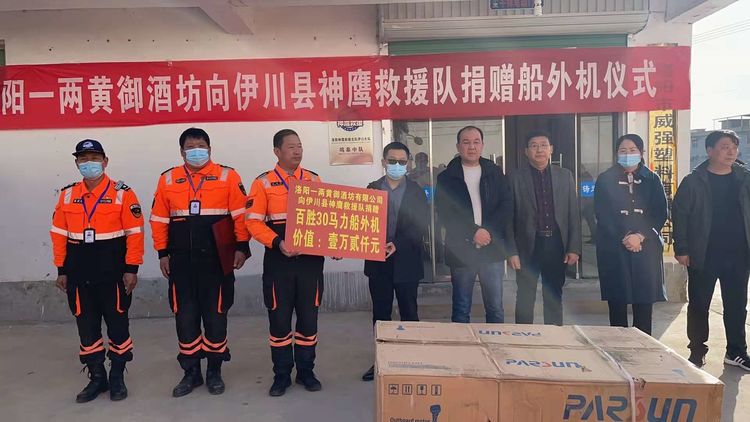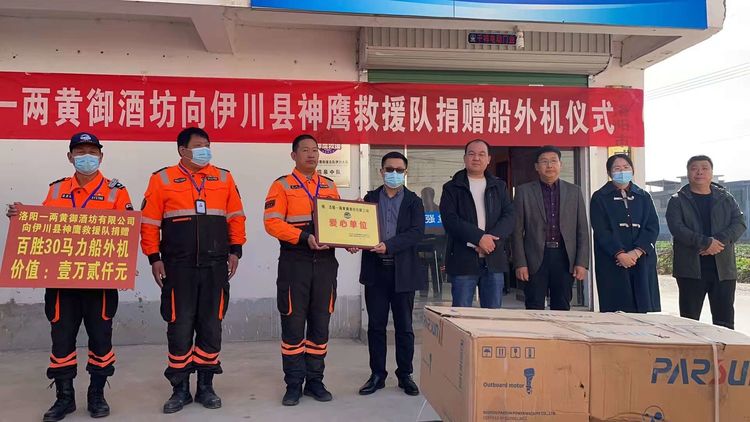 事件:2021年11月12日上午,在伊川縣神鷹救援隊鳴皋中隊,隆重舉行捐贈船外機儀式,愛心企業洛陽一兩黃御酒坊向伊川神鷹救援隊捐贈價值壹萬貳仟元百勝30馬力船外機一臺,出席本次捐贈儀式的有愛心企業家姜會明先生、中溪村黨委書記姜毅濤書記和村委委員們,伊川神鷹救援隊隊長梁緒偉、副隊長張志強、指導員李志輝、以及伊川神鷹救援隊鳴皋中隊的隊員們,儀式上梁緒偉隊長對愛心企業的無私捐贈表示感謝,并給愛心企業家贈送愛心企業牌匾。在儀式進行過程中,11月8日幫助尋找到的兒童家屬送來錦旗表示感謝!感謝伊川縣神鷹救援隊在他們危難時刻及時幫助尋找到孩子。